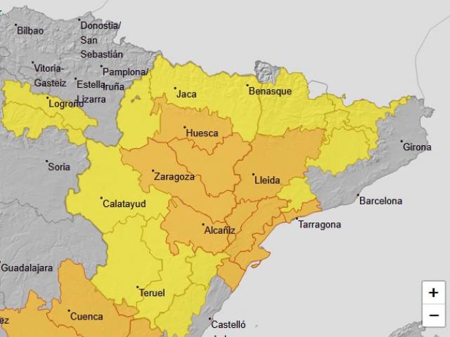 Aviso de nivel naranja por lluvias en Ribera del Ebro (Zaragoza), Bajo Aragón (Teruel), Huesca Centro y Huesca Sur (Huesca).