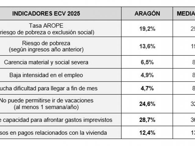 Aragón ha experimentado una mejora en todos los indicadores clave que configuran la tasa AROPE respecto a 2024 y se ha convertido en una de las CCAA con menor riesgo de pobreza y mayor capacidad de resistencia económica en el contexto nacional.