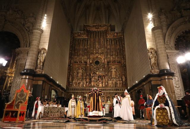 La Catedral del Salvador ha sido escenario esta tarde del acto central de la Coronación de los Reyes de Aragón, con la recreación de la coronación de Fernando I como rey de Aragón. El evento forma parte de la programación organizada por la Dirección General de Patrimonio Cultural del Gobierno aragonés y se desarrolla durante el fin de semana en los alrededores del Palacio de la Aljafería y La Seo.
