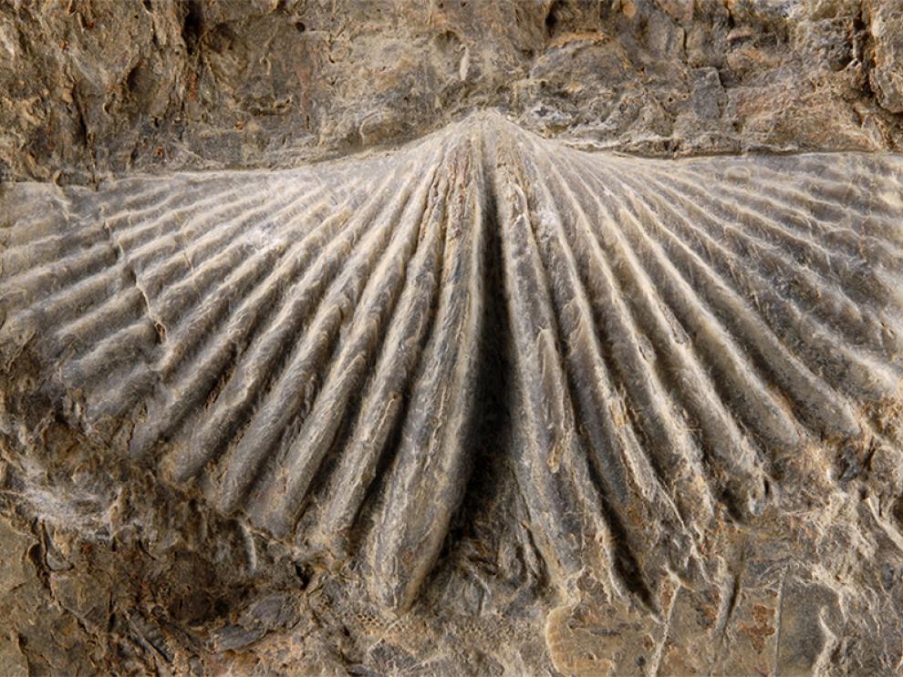 Concha fósil de un braquiópodo espiriférido del Devónico en Santa Cruz de Nogueras (Teruel). -