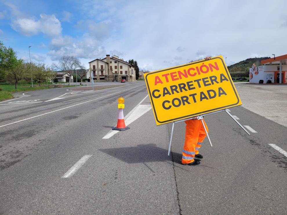 Un operario de la Dirección General de Carreteras e Infraestructuras retira la señal de para dar paso al tráfico.