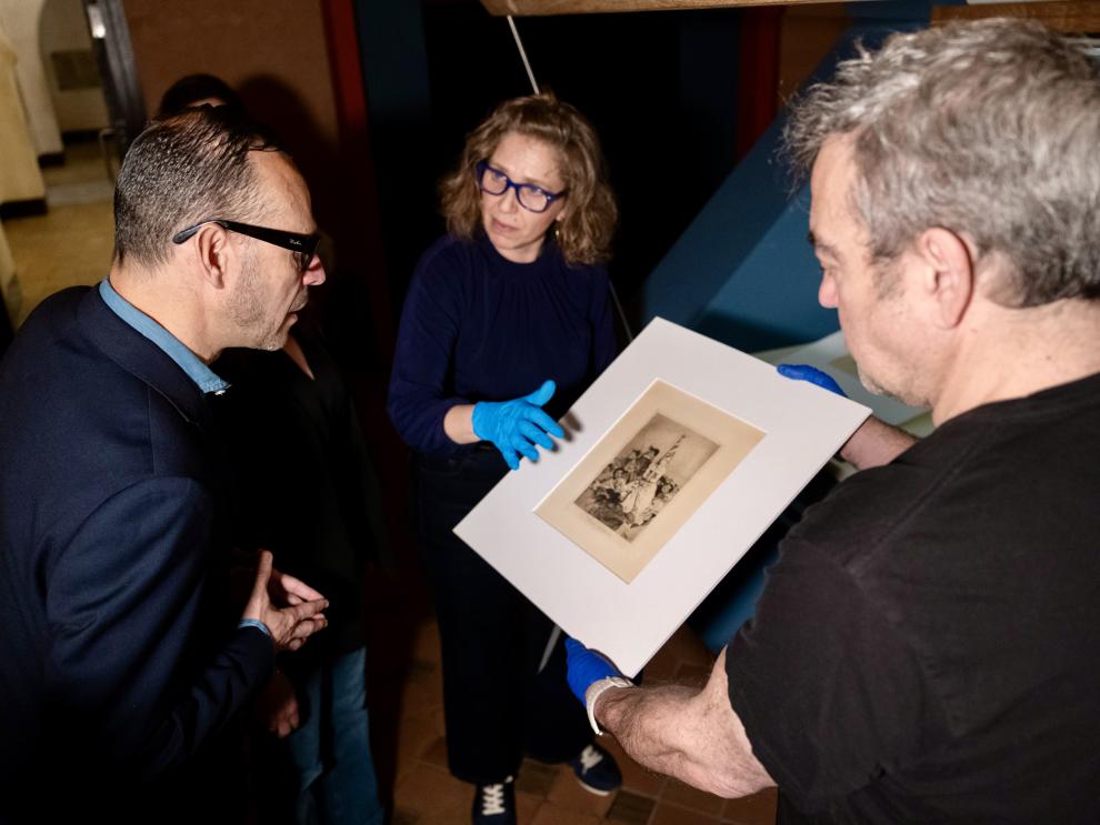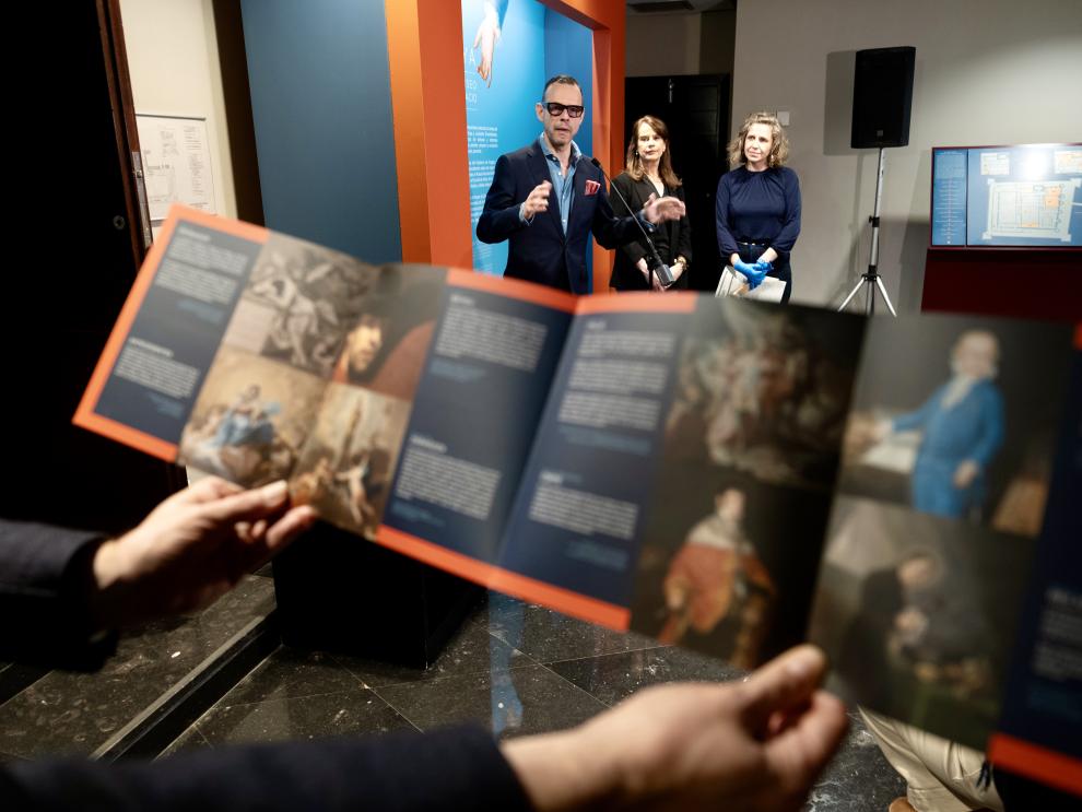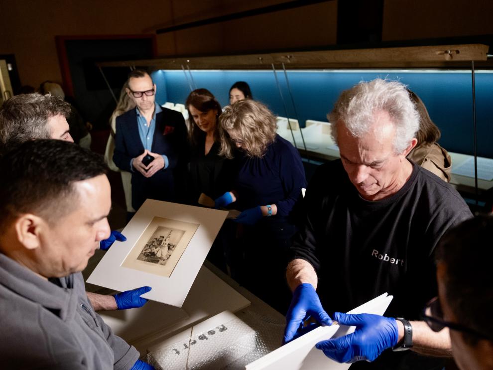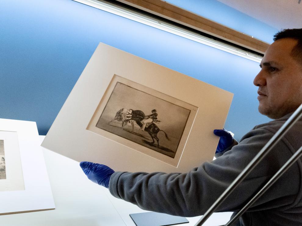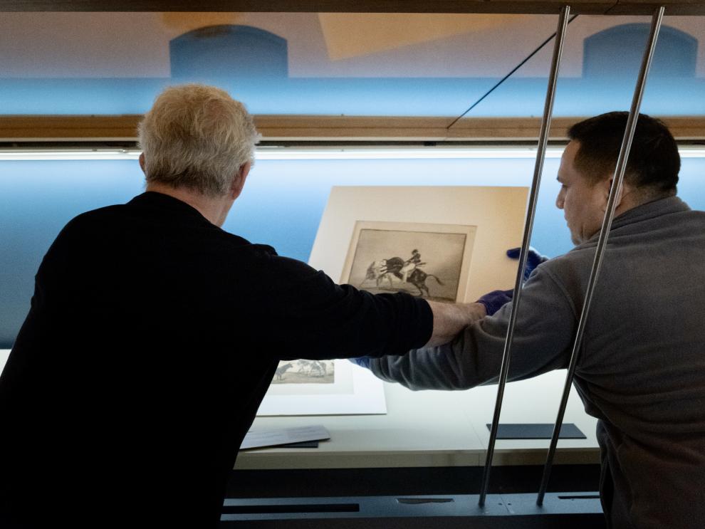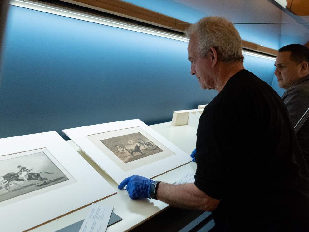 El director general de Cultura del Gobierno de Aragón, Pedro Olloqui, asiste al primer cambio de grabados de la exposición 'Goya, del Museo al Palacio'.