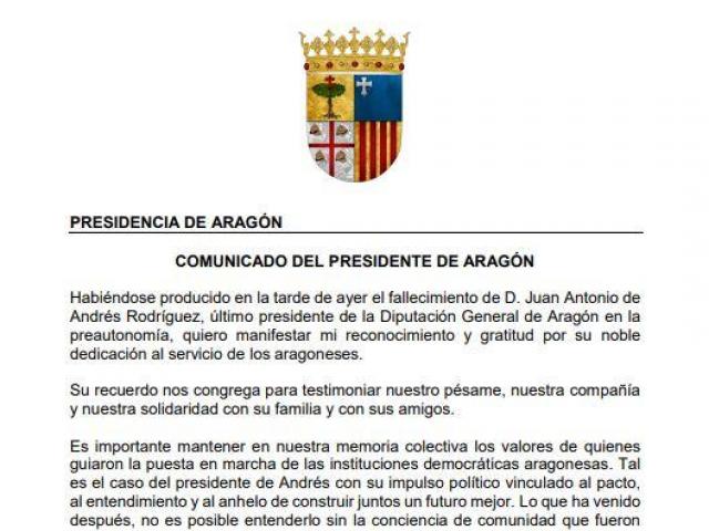Azcón, además, ha firmado un Comunicado Oficial en el que manifiesta su "reconocimiento y gratitud por su noble dedicación al servicio de los aragoneses" y envía su pésame a la familia y amigos.