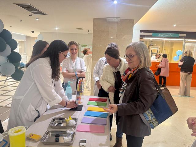 Con motivo del Día Mundial de la Diabetes, que se celebra este viernes 14 de noviembre, desde el SALUD se han organizado distintas actividades de divulgación sobre esta enfermedad y los cuidados que requiere. En el Hospital Clínico Universitario Lozano Blesa de Zaragoza, por ejemplo, se han realizado hoy actividades con los usuarios que se acercaban al centro para no solo informar, sino también "romper estigmas y normalizar la vida con diabetes", en palabras de Ester Sánchez, enferma educadora en diabetes y una de las organizadoras de la actividad.